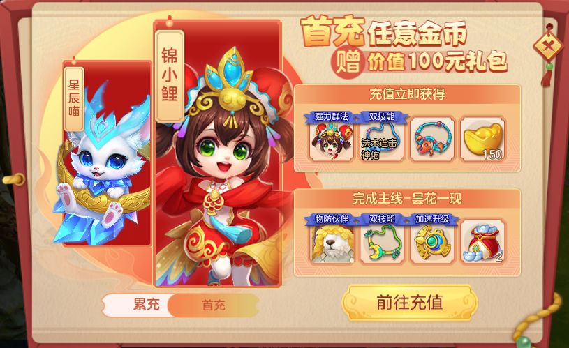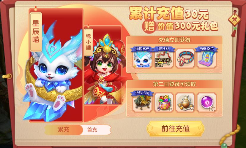 游戏内首充充值任意金额,即可获得“千金难求”天资珍稀宠物锦小鲤,累计充值达到30元可再获得一只变异宠物星辰喵,更有时光轮、金币等共计400元礼包相送!