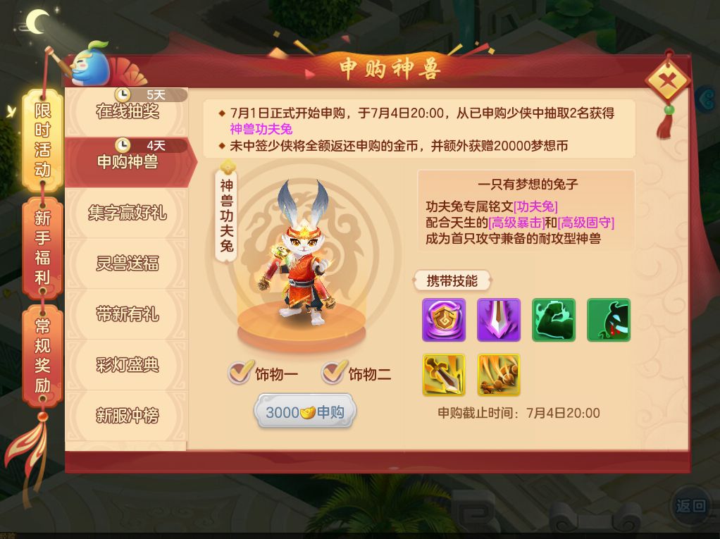 7月1日正式开始申购,并将于7月4日20:00,从已申购少侠中抽取2名获得神兽功夫兔!少侠可使用3000金币参与申购,若未中签,将全额返还申购所使用的金币,并额外获赠20000梦想币。