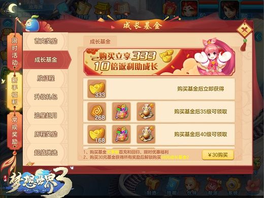 新服推出成长基金,30元即可购买,购买后立刻获得等价值金币,达到指定等级还可领取包含金币在内的各种返利,总价值高达10倍!获得所有基金奖励后还可解锁购买68元进阶基金。