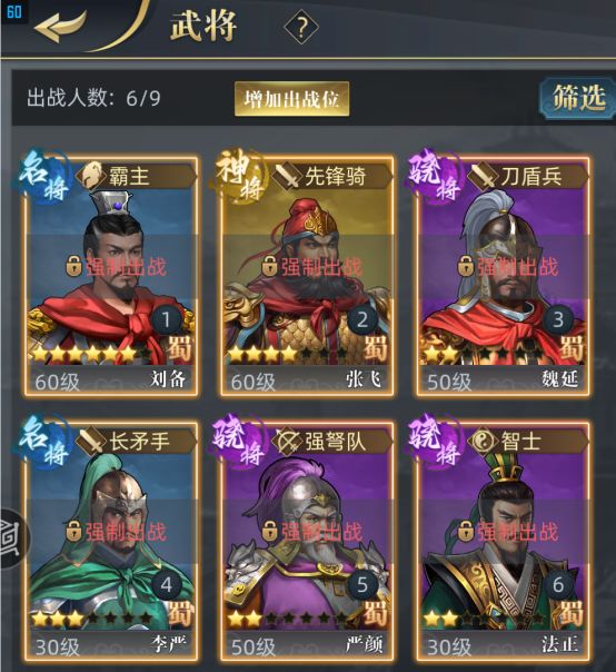 刘备、张飞、魏延、李严、严颜、法正强制出战。