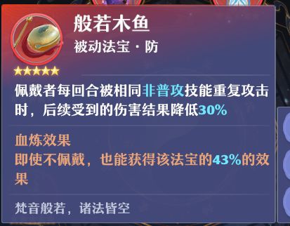 在聊天书之前首先要说一个更新点,就是关于法宝“般若木鱼”的更新,更新之后的木鱼,不携带最高可以获得50%的收益,也就是佩戴者每回合被相同非普攻技能重复攻击时,后续受到的伤害结果会降低15%。如果携带则可以达到30%以上。
