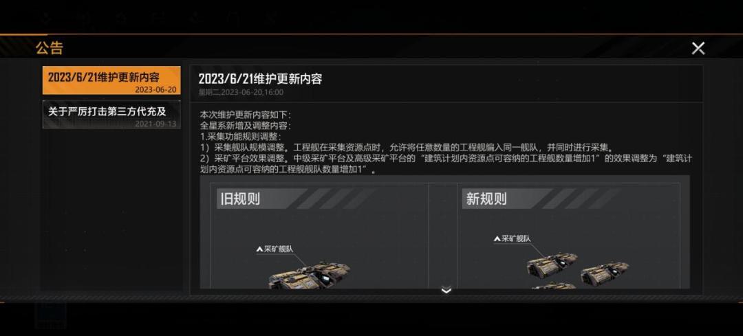 更新内容1:工程舰采集资源点时允许将任意数量的工程舰编入同一舰队,同时进行采集。