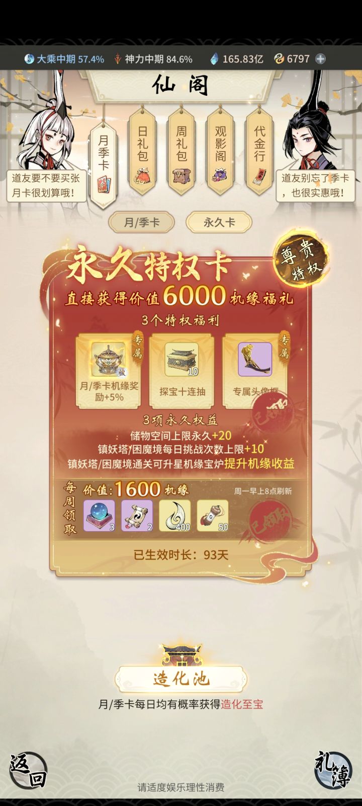 1。礼包买什么:必氪每日68道缘玉,拉好友好感度能提供很多资源,所以一定要拉满道缘。每周198跃迁令。天命无上限,多买648即可。拉满天命拿衣服,衣服就是皮肤,是这个游戏的终极玩法,比的就是谁衣服多。