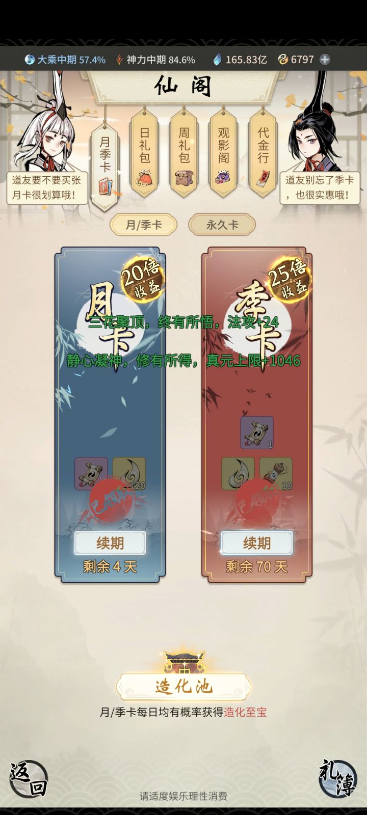新人小伙伴一定要记住,一念逍遥的礼包越贵,性价比越高,举个例子宁可买10个648礼包,也不要买20个328礼包。以此类推6元礼包和30元礼包性价比最低,不建议购买!月卡季卡永久卡性价比非常高,建议购买!