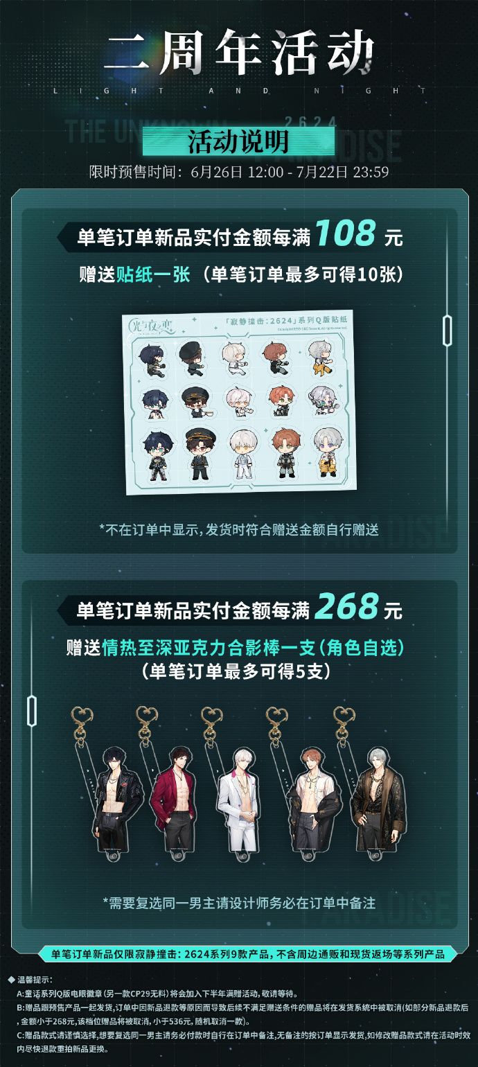 ◆ 单笔订单新品(仅限寂静撞击:2624系列9款产品,不含周边通贩和现货返场等系列产品)实付金额每满108元赠送贴纸1张,最多可得10张,不在订单中显示,发货时符合赠送金额自行赠送。
