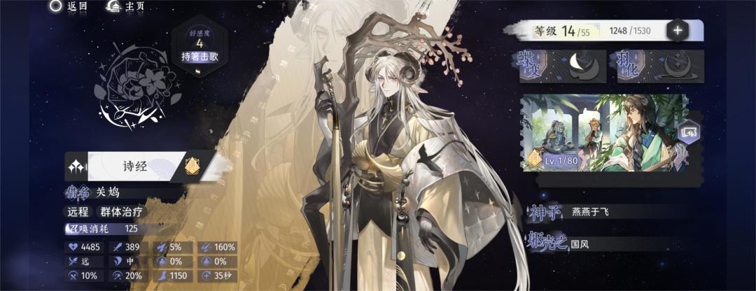 结缘,(就是卡池)月下风吹花树,洋洋洒洒,结合抽卡动画,就是彩蝶飞舞(带了“好运”)迎来神秘贵客。(后面有稍稍的吐槽整体设计的氛围感还是很不错的,如果背景动态还能多点就更好了。