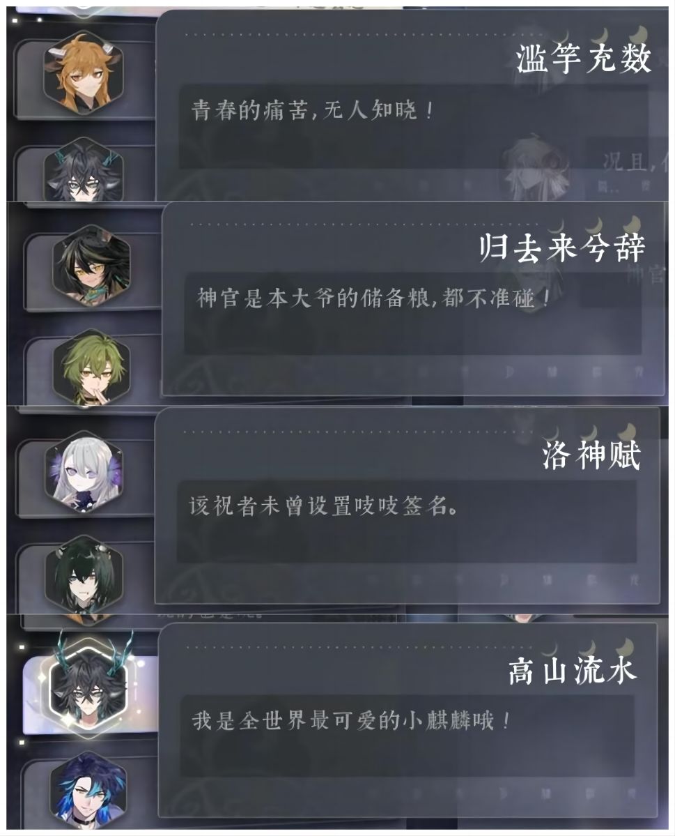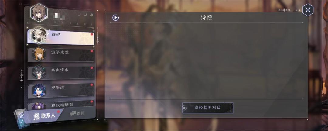 加之,角色名源于古代文学(诗经、十面埋伏、本草纲目等),让角色的身份带上时间之远之深的朦胧色彩,但他们的性格却靠近的,每个角色都有其独特的风趣灵魂,互动通讯让角色变得立体形象,同时也拉近了与玩家的距离。