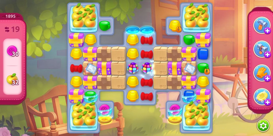 咱们看一下上面这个图就是进入游戏时的画面,是不是觉得很难呀?箱子上面贴的太多东西了这个障碍物清理起来比较麻烦,不过可以完成,先把这中间的两组三消消出了,然后惊喜来了!(看下方)