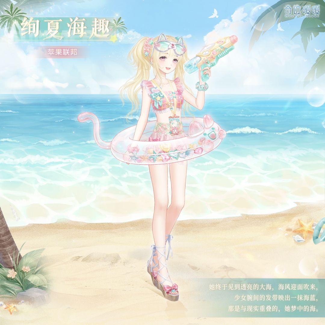 【绚夏海趣】含正常姿势与特殊姿势,特殊姿势手套“流珠溢彩”、“绚夏海趣”,精美可移动摆件“未知挑战”。*海报展示妆容为“稚气笑颜”。