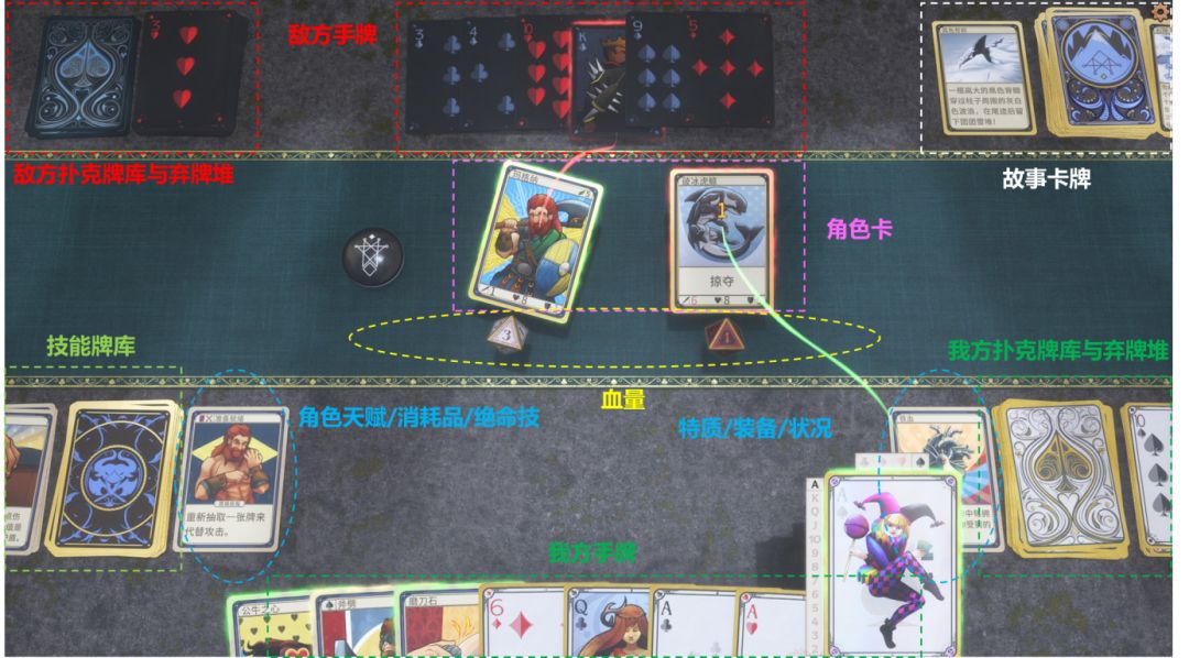 1.玩家的目标是将所有敌方角色的卡牌血量打成0即可获取胜利。整个界面的右下角为我们的扑克牌库,玩家的扑克牌摸牌数量取决于敌人与我方攻击值与防御值的差值(我方摸牌数=我方攻击值-敌方防御值)。同理,敌人的扑克牌摸牌数量取决于我方与敌方攻击值与防御值的差值。