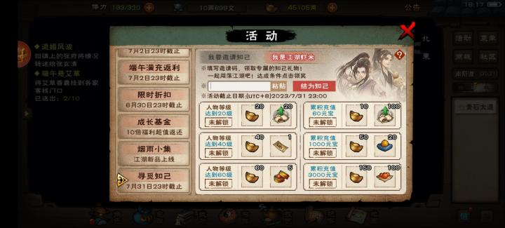【活动攻略】最新蚊子腿+端午节限时活动流程!7日签到:获得「元宝」1000、「金丝缠珠冠」1、顺脉丹2、生生造化丹2、清虚丹2挂艾草:获得「元宝」300,端午幻化石一块。泡药浴:需要玉兰花5、白芍10、金银花6、甘草20,获得气血+5、韧性+1。放风筝:获得「福缘丹」×1,「安」buff(攻击与防御提升8%,次数5),「财」buff(野外战斗额外获得300文,次数10)。---------------------------------------------------【重点来了】右上角点开活动,找到寻觅 知己活动,然后点开我是小虾米,想一起薅羊毛的输入我的邀请码【ADCH5S】可获得:400元宝+马车票+8万阅历+120体力+100洗髓丹+20顺脉丹!(奖励性价比极高,不可不做呀!)最新激活码:夏至生辉、惊弓破梦、火凤燎原、栀子花开、不负武侠梦、试炼重现入谷获生。