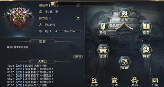 右上部分则主要分为成员、任务、捐献、官爵、城池、外交几个功能,右下部分为印玺、仓库、商店、沦陷。