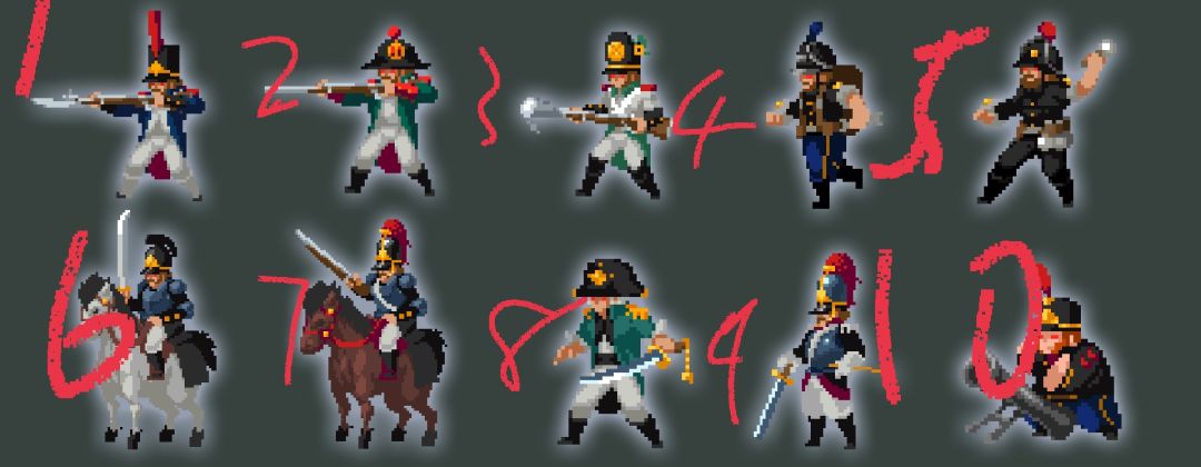 上面提到的这几位都可以在18,19世纪在法国军队中出现。没提到的45679这五位,从立绘大图上看,只有两位骑兵带着的头盔看样式属于钢盔,钢盔在1915年才引入法国军队。4和5由于没有立绘大图,只能看出是一种平顶帽,与1914年期间的法国军装帽子相似。