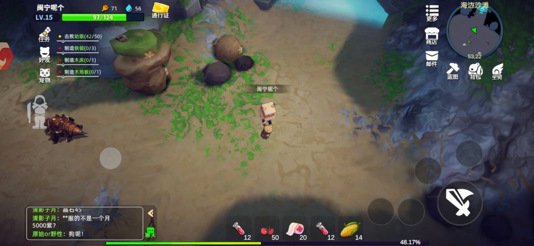 5.小树林,草滩,海滩,石坑来回刷,药水够就去废墟深处,这段时间做出分解机,皮革台。做第一个鞋子,分解机分解200碎片到铁锈镇飞乐园买2个神秘紫晶到25做橙色大锤,也为布套做准备。