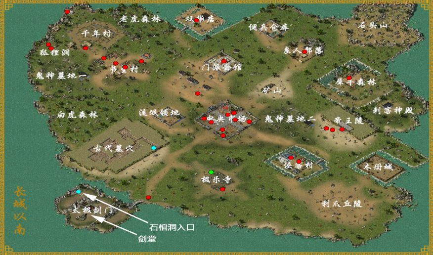 在太极剑门的外部,位于长城以南的西南角,玩家可在长城以南寻路前往,此处由“赦龙组”和“青龙刺客”把守。危险系度较高,建议神话境以上玩家挑战。