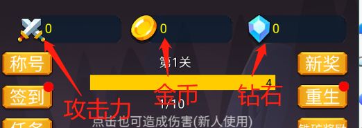 最上面一排,依次是主角的攻击力、金币数量、钻石数量。