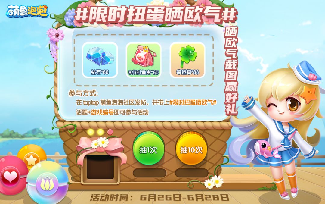 参与方式:在taptap萌鱼泡泡社区发帖扭蛋乐园欧气截图,并带上#限时扭蛋晒欧气# 话题+游戏编号,即算参与成功;
