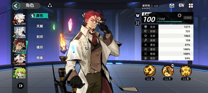 天赋百分百加成:攻击0,暴击10%,暴伤10%,抵抗30%,精准15%,防御88,生命253,速度10。