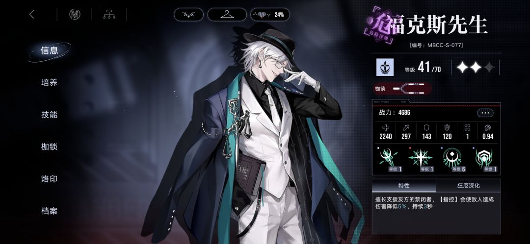 对群控特工卡(点名卓雅临界化)二阶即可上场,性价比极高,其被动一的延长破核时间的效果简单粗暴且十分好用。 如果想三阶开专的话,需要注意的是只有破除怪物最后的核心的禁闭者才能吃福克斯先生的专烙效果