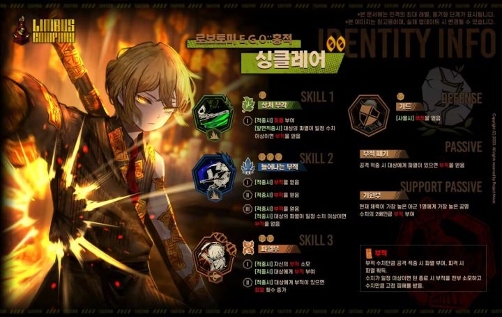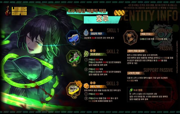 K公司的安瓿:回合开始时:若层数不高于某一定值,根据效果层数按比例使自身恢复体力;若层数高于某一定值,立即阵亡[00]脑叶公司E.G.O::朱符 辛克莱
