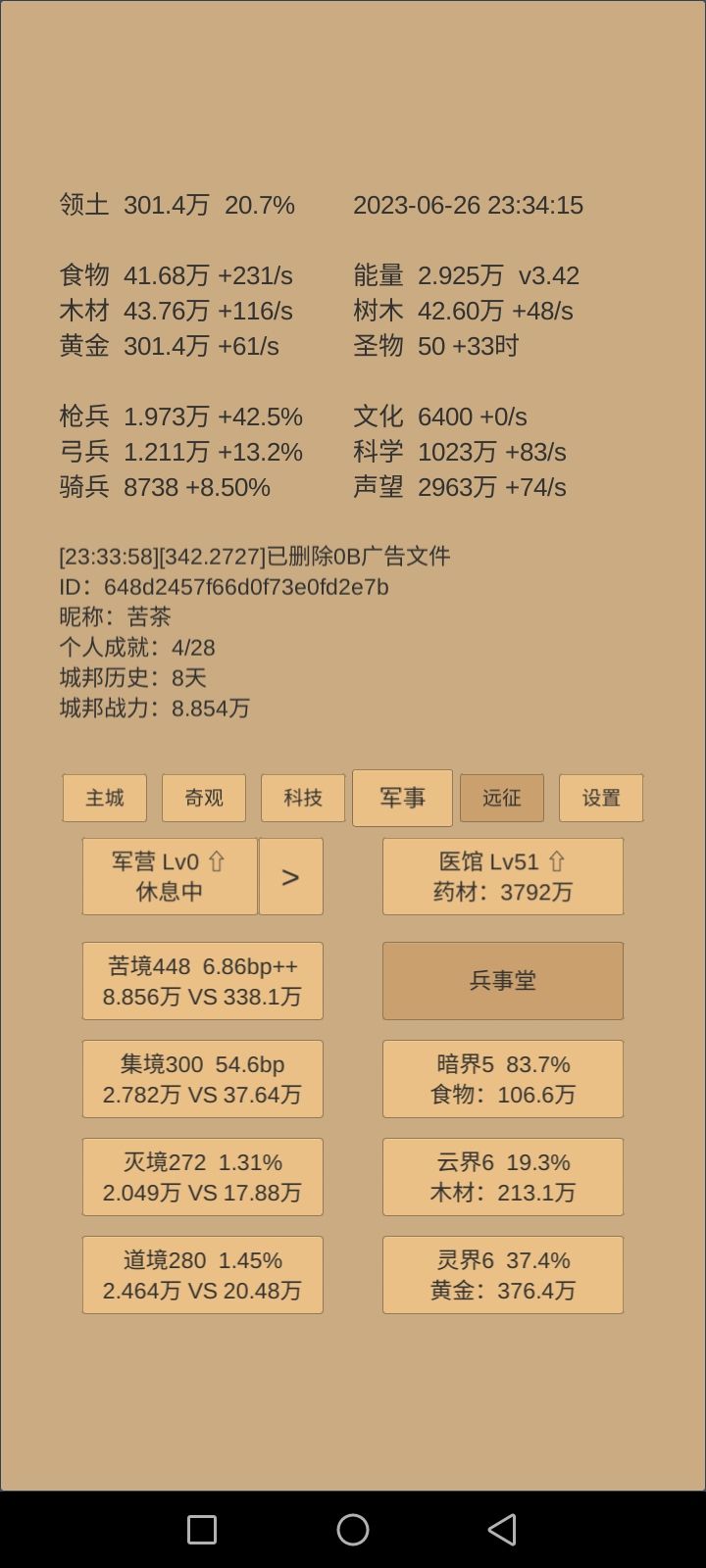 2.卡苦境。就是得药材的那关,卡49关不推。到50就会自动推关。我在医馆收益一百多每秒才开始推苦境,一口气收了六千多万药材。300万领土前没缺过药材。