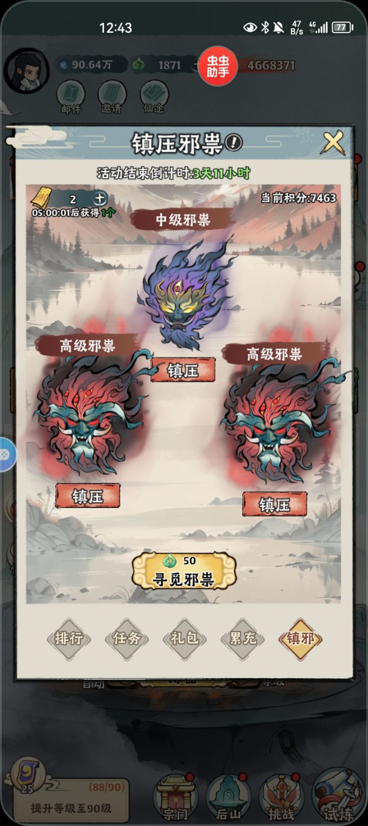 PS:镇邪活动到来之前,灵玉也需要囤着(每天用来扫荡斩妖即可),因为这个活动不仅消费引魂珠,同样也消费灵玉(如下图所示,镇邪尽量寻找高级邪祟镇压,每次手动刷新需要消费50灵玉;灵玉不足的情况下,可以去刷其它副本)。