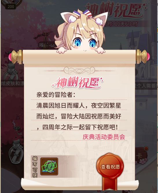 冒险大陆因祝愿而美好,一起来留下你的祝愿吧!前往神树发送寄语即可领取周年庆版【黑羽月卡】。