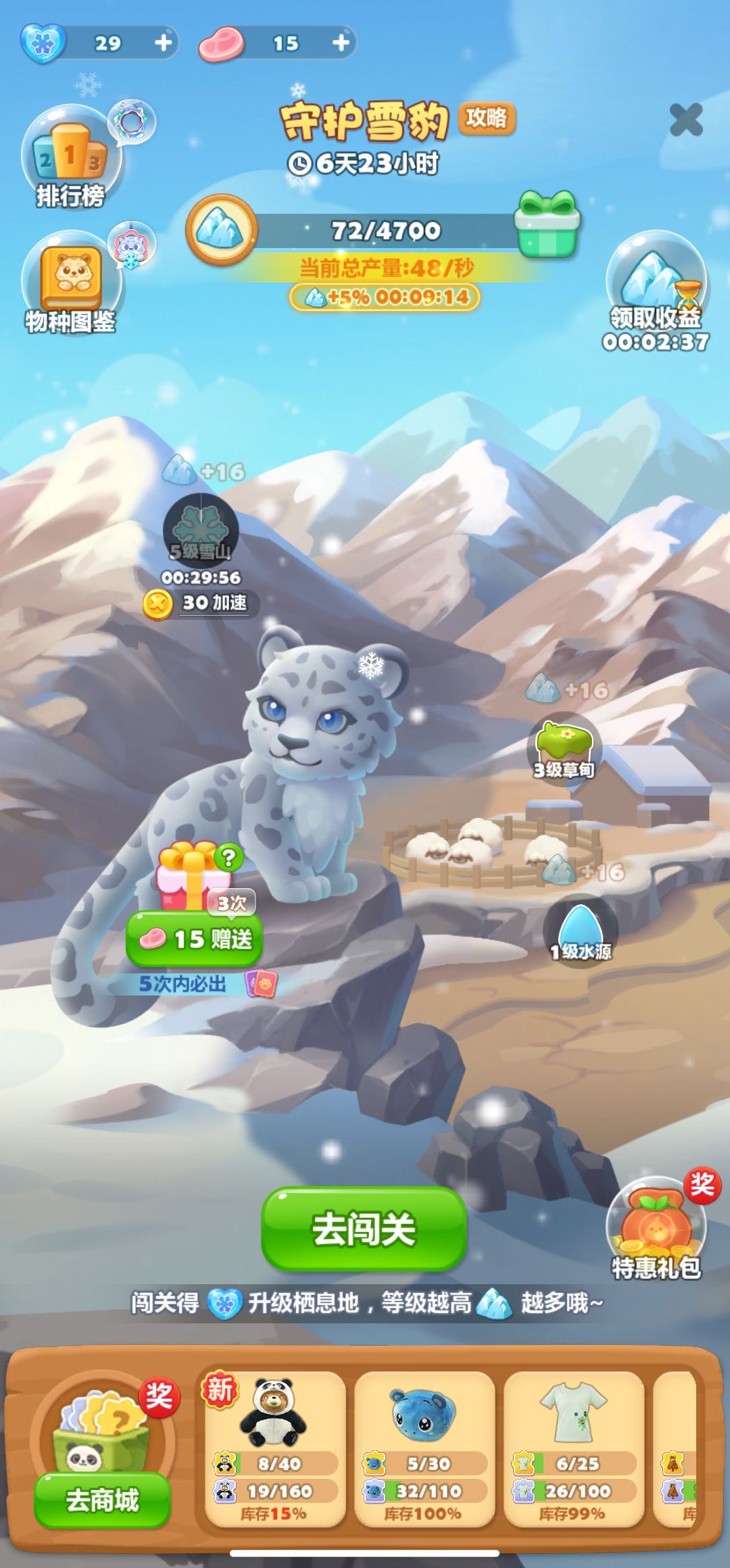 活动期间闯关若达到三星、彩星,或成功通过副本关,将额外获得肉奖励,可赠送给栖息地中的雪豹。