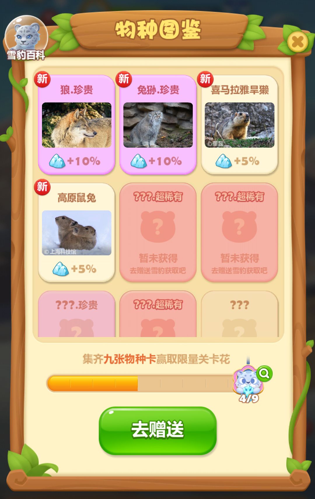 3、多多赠送雪豹获得回礼,集齐物种卡获得更多环境健康值加成效果。
