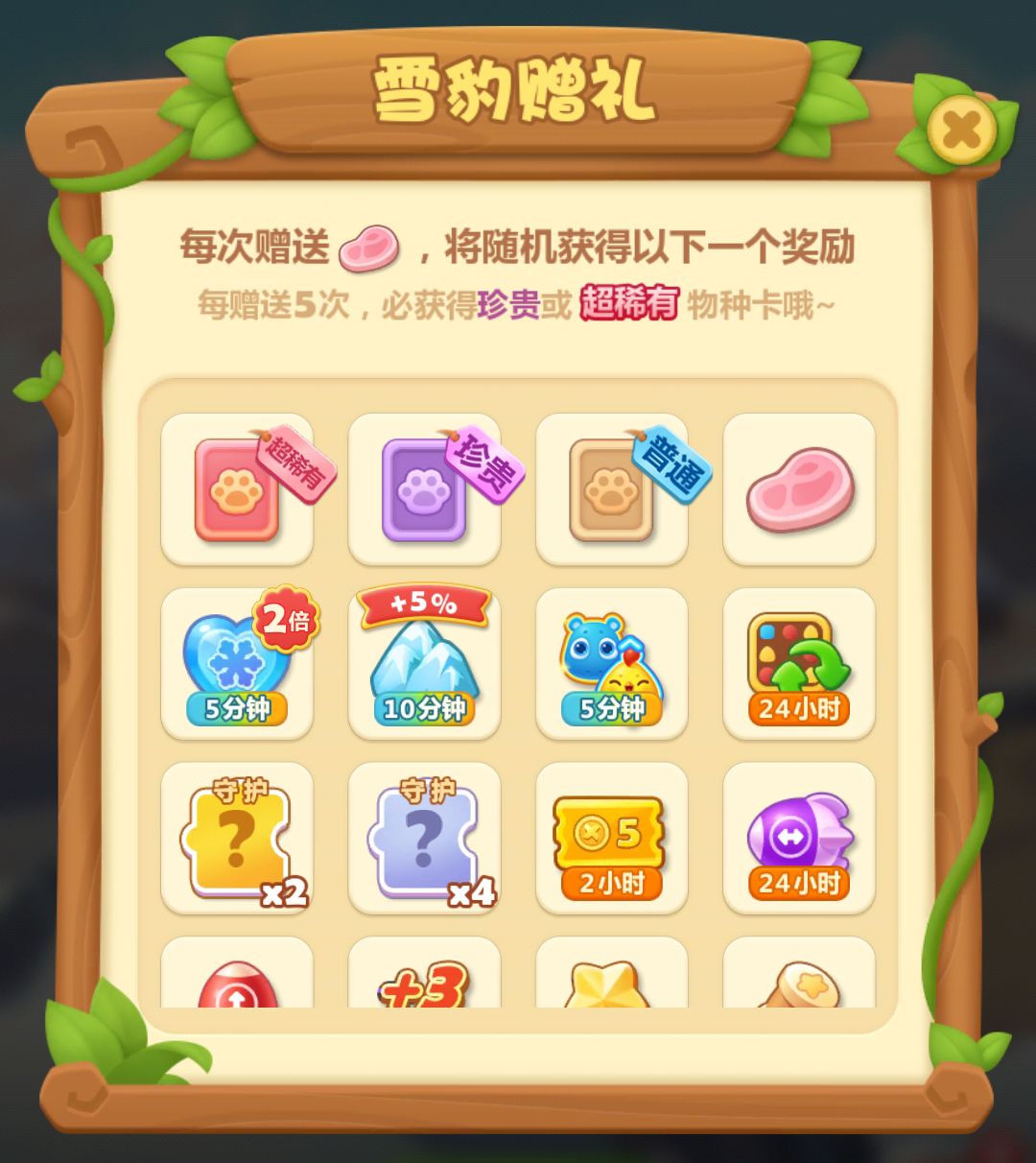 每次将肉赠送给雪豹后小村民都将收到赠礼,包括双倍爱心代币加成、环境健康值加成、闯关道具以及物种卡。