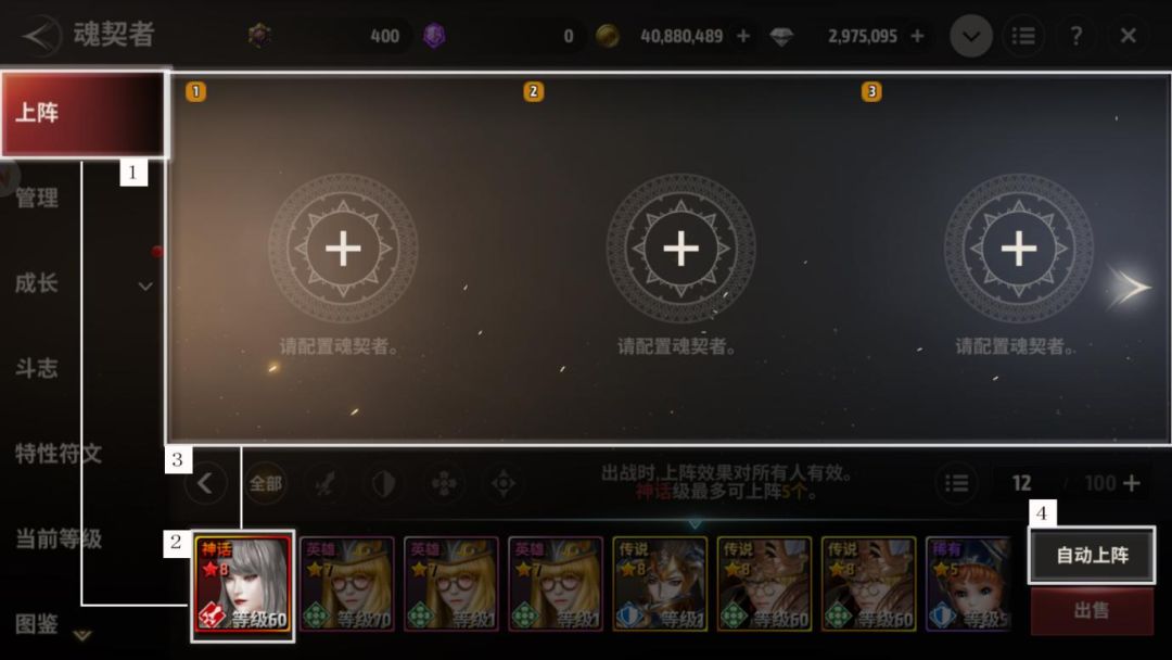 在魂契者管理系统的[上阵]界面中,初始设定可上阵3名魂契者。如果想配置更多的魂契者,可以消耗钻石,或使用通过完成游戏任务免费获得的蓝钻来开启额外的第4、5个上阵位置。在配置好的阵容中,同一时间只能选择1名魂契者出战,如果当前出战状态下的魂契者死亡,将自动召唤魂契者阵容中的下一个魂契者。不必担心魂契者死亡,幸存者们可以选择免费将其复活至10%体力,或消耗金币复活至100%的体力哦~