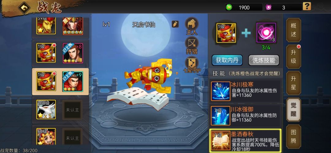 不过也建议普通玩家在积攒三五百个战宠内丹后,再强行给书灵以量冲关,力争突破瓶颈达至觉醒,而后再将天赋专技洗练到橙色品质,让天启书仙成型成战。不过想将书灵转化为书仙,并洗练出心仪技能的过程向来坎坷,这需要主公有足够耐心和时来运转的运气。