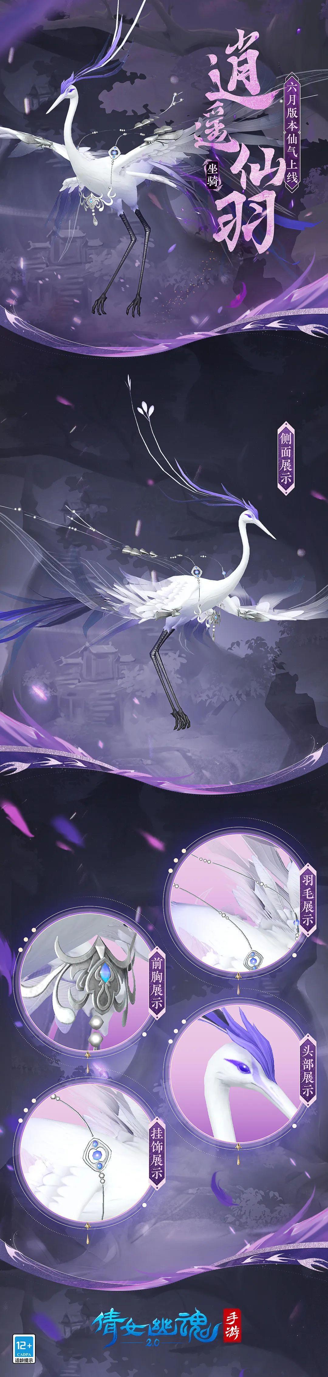 祥瑞降世,仙气萦绕。只见它通体紫白相间,莹白如雪的羽翼之上点缀着轻盈的蓝水晶。当它翱翔于九天之上,尾羽划过天际,优雅地留下碎光和闪耀的星点,带你俯瞰三界美景,甚是妙哉!