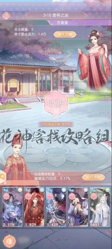*换上符合洋气、异域、绛裳三个TAG的装扮即可,这里也不需要太讲究,直接换上初始送的绯色套装,并将至少3张羁绊卡实力提升至14000以上即可战胜李嫣然。