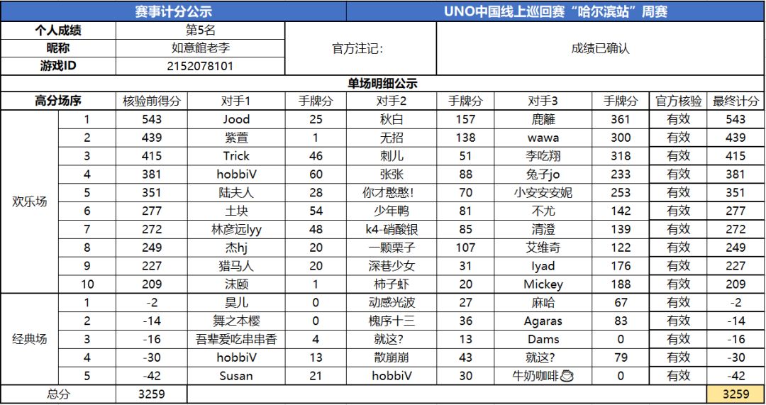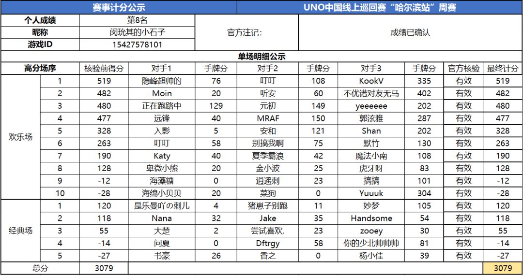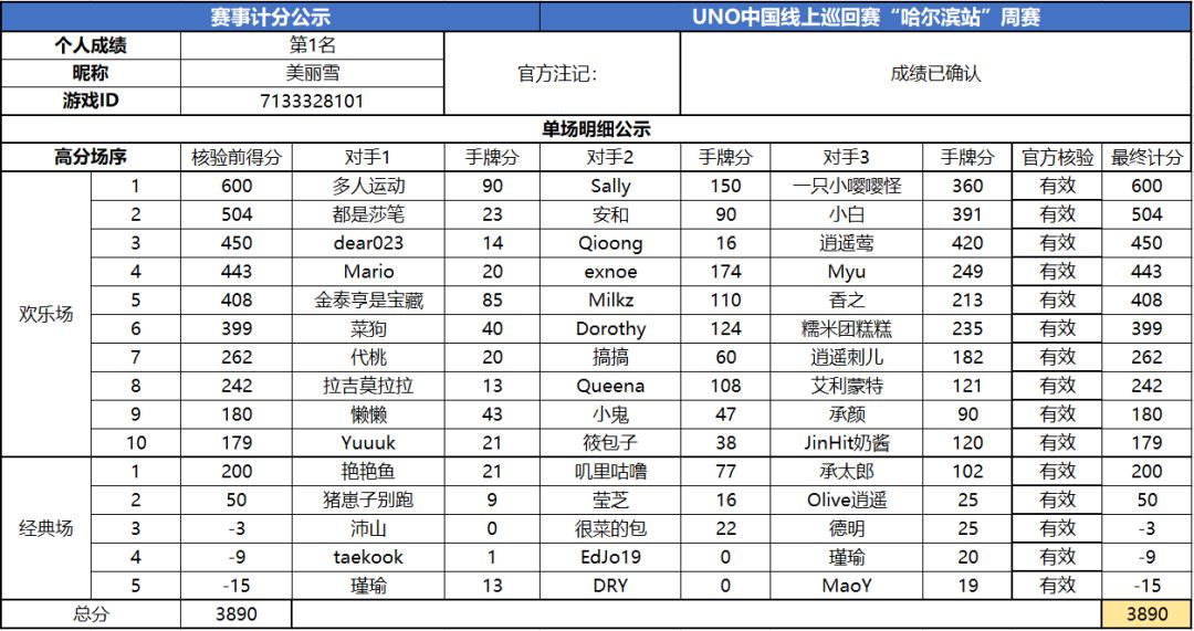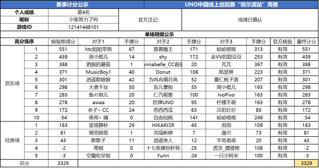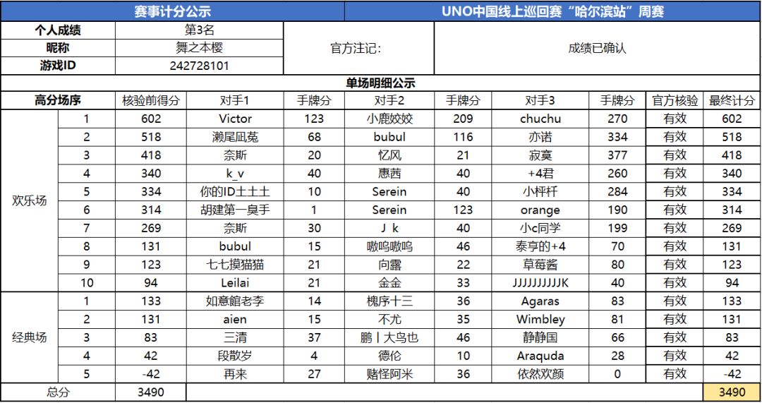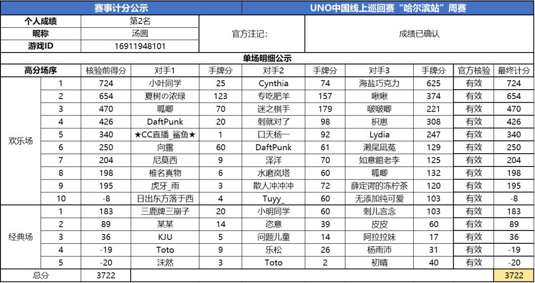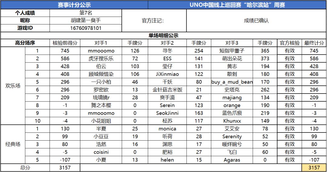 以上就是2020UNO线上巡回赛“哈尔滨站”周赛的战报内容啦,为了保证我们巡回赛的公平公正,根据规则,至少完成10场欢乐场及5场经典场的玩家才会判定完成本站巡回赛,而利用多开或其他违规操作的选手我们也会取消本次巡回赛成绩。