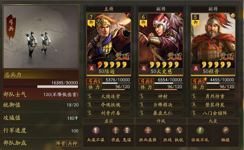 2.太史慈:当锋催决+暴戾无仁 兵书:胜而益强/胜战/执锐 +20速 +30武