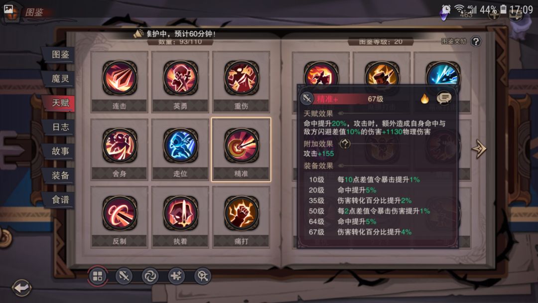 精准:增加命中,根据自身命中与目标闪避来附加额外伤害、暴击和爆伤。一周目怪物闪避除了乌鸦外感觉不明显,从二周目开始,怪物都开局自带各种增益buff,包括闪避暴击爆伤等,周目越高加成越多,时空高层怪物的强度也相当于高周目怪物,一刀下去miss,那攻击再高也都是无意义的,所以说精准这个天赋就是必带的。