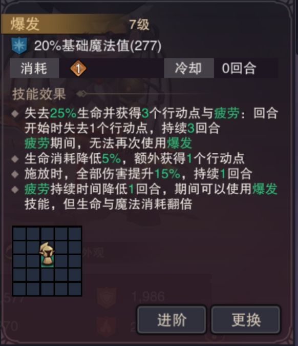 随着斧头时装技能-爆发的加入,斧头迎来了一波极致提升,满级爆发每次使用净赚3行动力,可代价却是巨额的血量和蓝量消耗,特别是血量,一不小心就暴毙了。