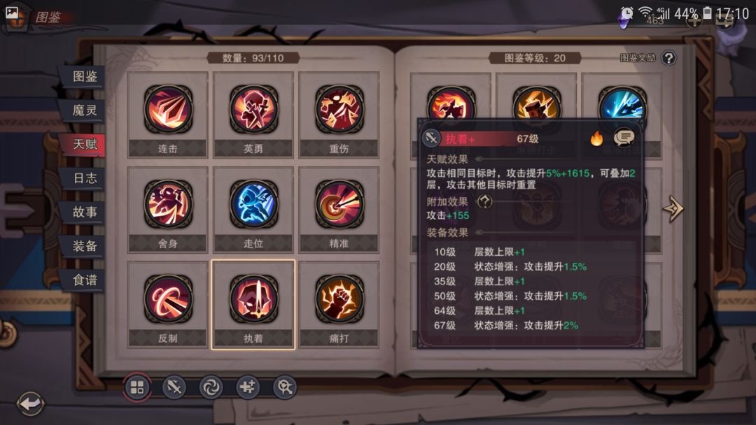 执着:攻击同一目标时大量加攻,可叠加,换目标重置。攻击叠加起来后是目前全游攻击加成最高的天赋,没有之一!打boss效果极佳,至于打小怪,一开始虐菜感觉不出,后面怪物肉度起来了,一个小怪也要砍好多下的时候就能感觉到执着的强力了。