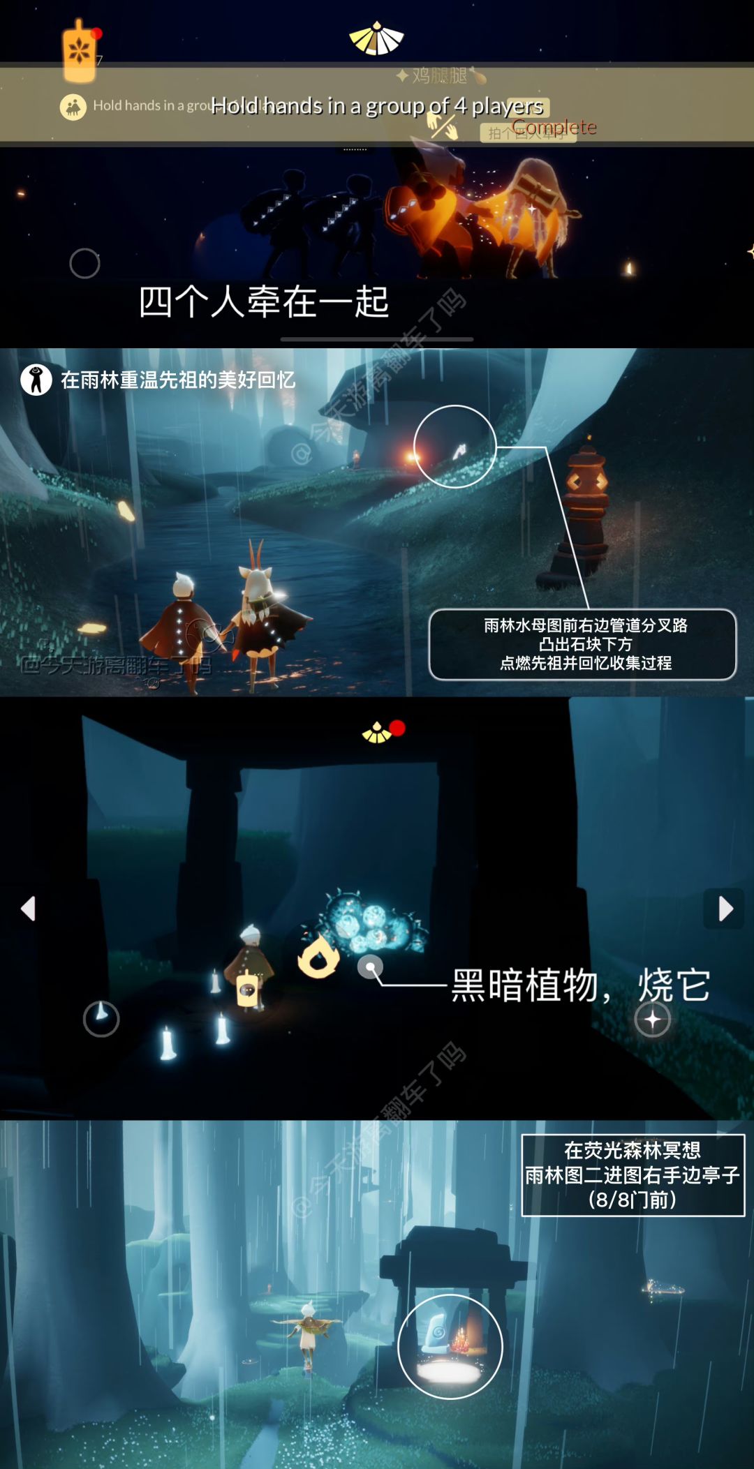 「四人牵手组队」四个人牵在一起,也可通过在表演季剧场右边洞口的火盆旁或追忆季庇护所向导先祖对面石碑处打坐重温季节任务完成。