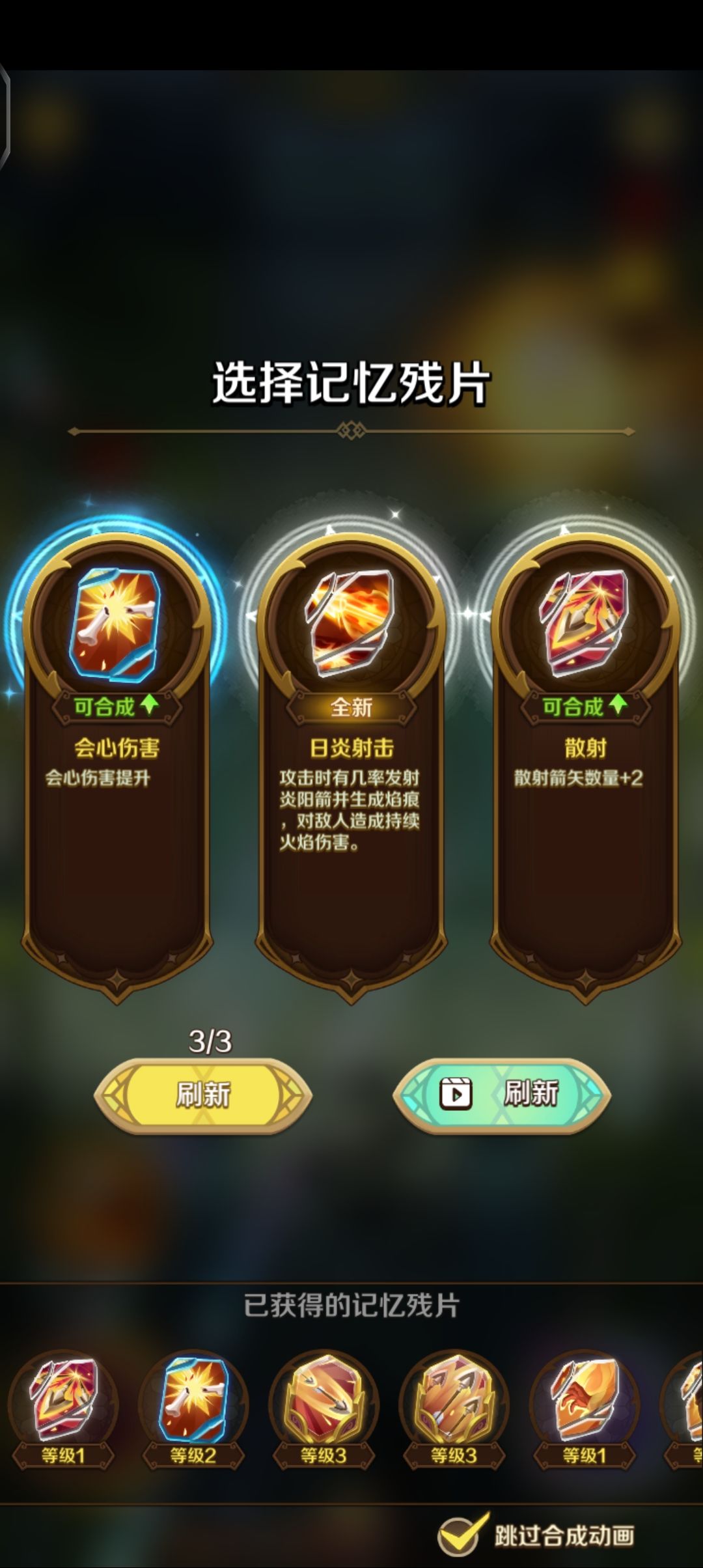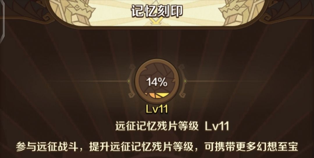 所以,想要自己中意的记忆残片,咱不能扫荡升级,要进入图内升级,用辉煌特权的三次来重随残片选项,以此方法来选择自己想要的残片(三次机会没有自己最想要的,也可以退而求其次,毕竟20个残片,怎么也能拿全自己想要的残片)