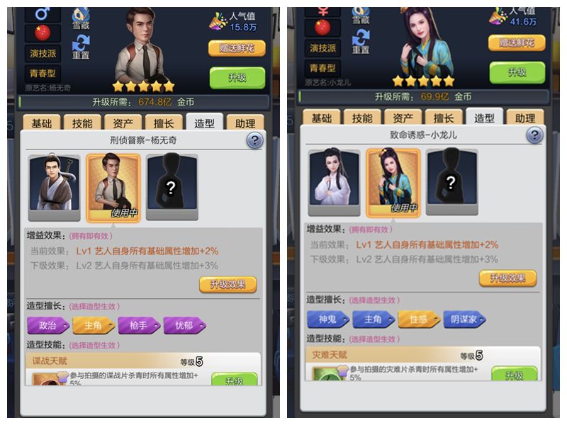 从艺人类型上看,两位艺人均属青春型演技派艺人。当前版本,青春型男艺人并不多,普通玩家除了冷飞达叔五星套中的冷飞为青春演技派男演员,接下来首屈一指的便是“神仙眷侣”组合中的杨无奇。青春演技派女艺人同样稀缺,而小龙儿主场面副艺术的优势属性决定了她独一无二的优越性。