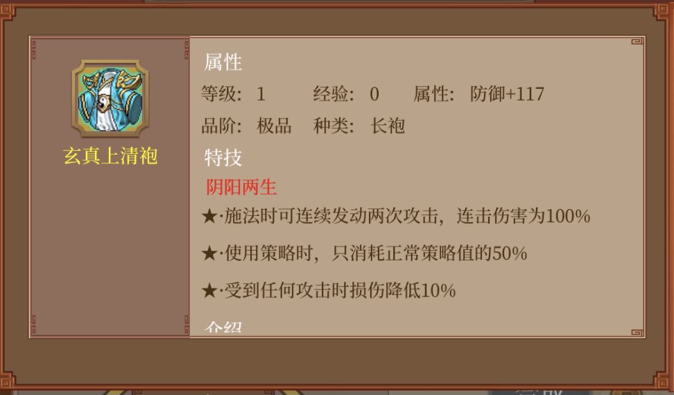 玉风亮银铠(1星):根据基础防御加智力。这件目前也就周瑜能用上,但它的加成并不算多,因为只算基础防御,也就意味着战场吃的buff没有用,甚至吃防御书1-6也没有用,因为那些书也是根据基础防御来加成防御。只有严防书直接加50防御是算基础的。周瑜的衣服基本从霸王和玉风里面选吧,各有优劣,玉风只算基础,加的少,但可以叠彰武剑等范围buff,上限会高一些。霸王前面说过跟彰武剑光环冲突的,虽然直接加面板,属性加的多一些,但上限不如玉风。我是选的霸王,考虑到玉风也就周瑜能用用,霸王可移植性强一些。