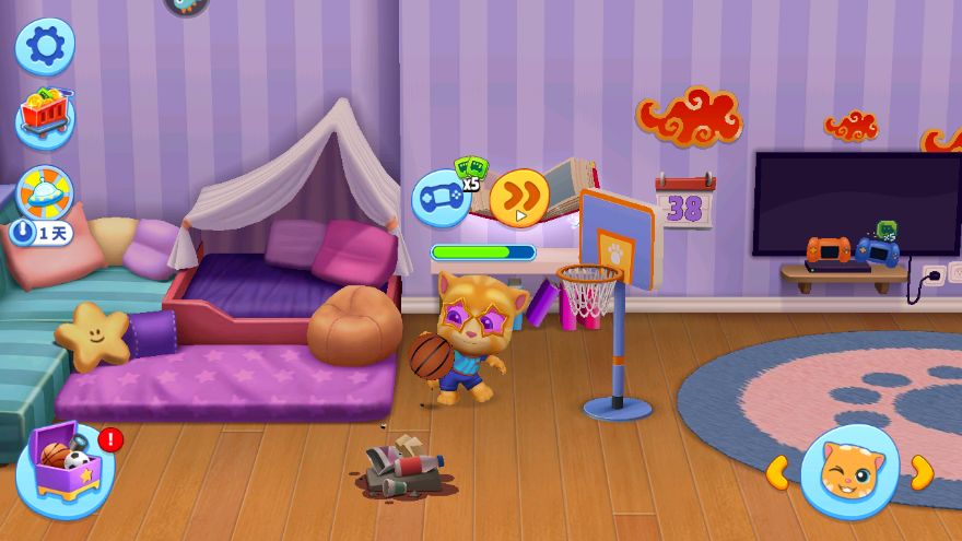 把我们刚刚解锁完的篮球架放在屋子里,再把宠物拉过来篮球架的旁边,就会触发宠物打篮球的动画啦。我们点一下宠物头上的游戏机,可以和宠物一起体验打篮球的乐趣哦。看看在与会移动的篮板的竞争中能够获得多少分吧!