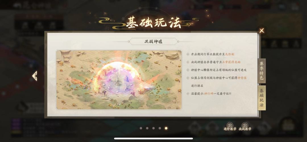 每个仙盟刚进入神墟地图的时候有自己的仙盟大本营,需要从仙盟的大本营不停地往神墟内围攻打占领领地,其中每一个领地(格子)都会有守军,没占领的是系统npc,已占领有驻守的是玩家,通常前两天大家选好路线以后尽量避免和其他盟冲突,最快最早的来到神墟周围,有实力的仙盟直接抢门占领,顺道占领高级领地(矿)。神墟周围前两天有四个入口,所以理论上来说,基本前四仙盟可以各拿到一个入口。因为高级领地、神墟入口、神行碑、司剑阁、神墟中心会产出神意值。在第三天决战神墟后,根据几天神意值加起来决定最终排名。