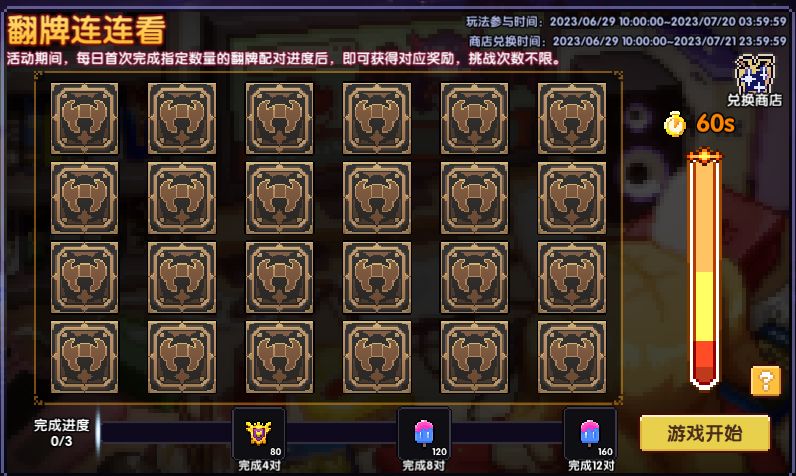 2.若在规定时间内未能正确匹配全部卡牌,可点击【继续挑战】再次参与,重新参与并不会打乱卡牌原有的位置