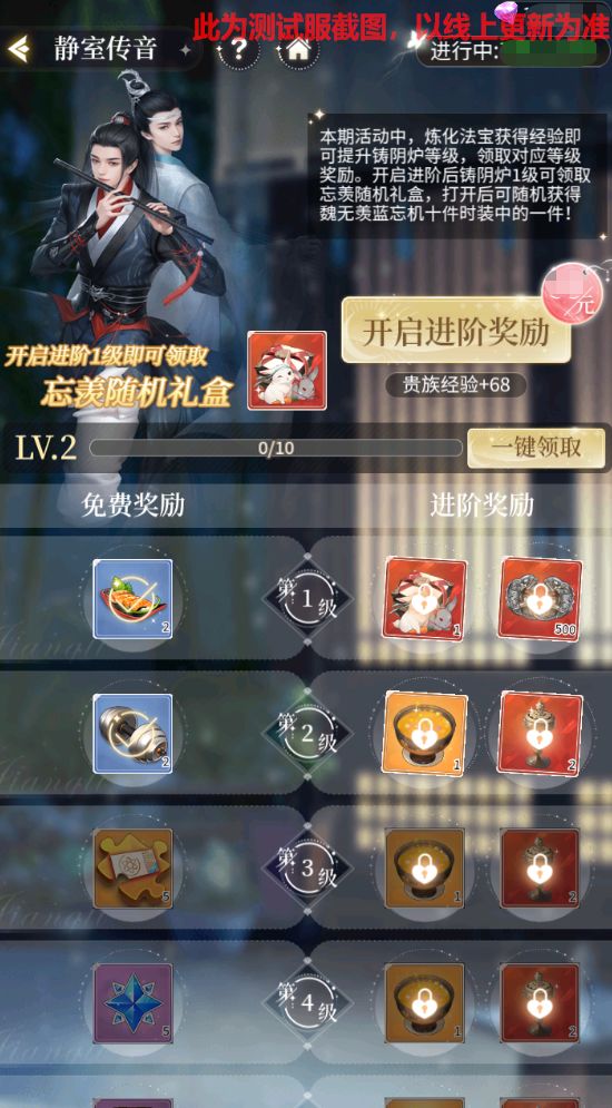 静室传音设有免费奖励和进阶奖励进阶后可获取大量联动活动道具和「忘羡随机礼盒」