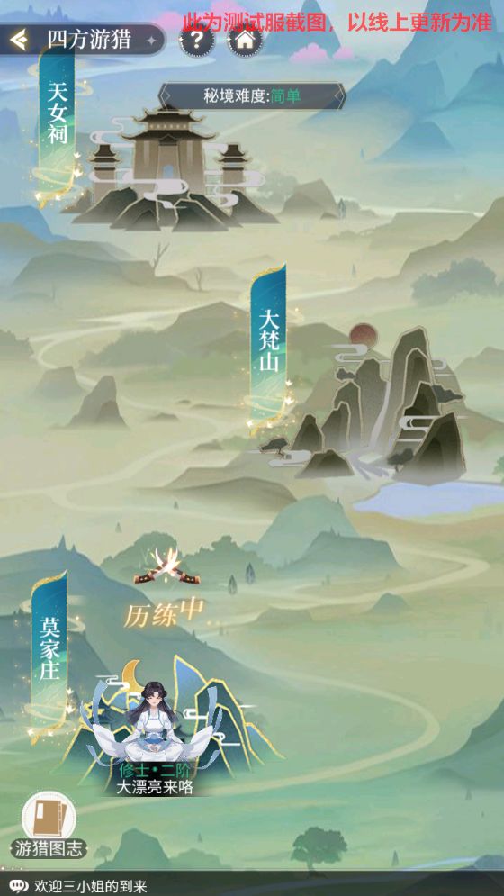 在秘境修炼中提升仙力之后可以在四方游猎中历练自己四方游猎分为6个秘境,可以依次探索秘境之中有不同的事件处理事件可以获得不同的奖励