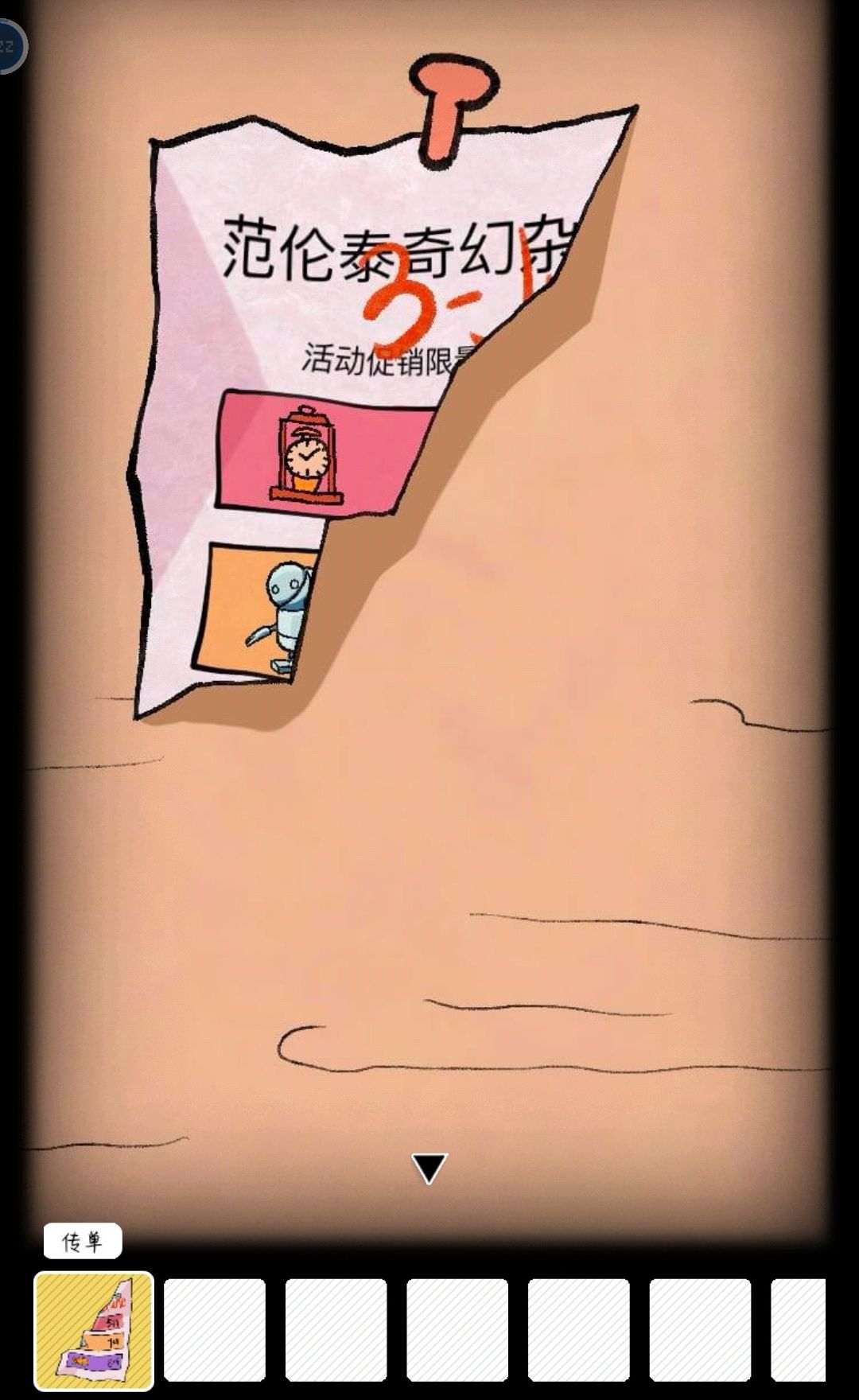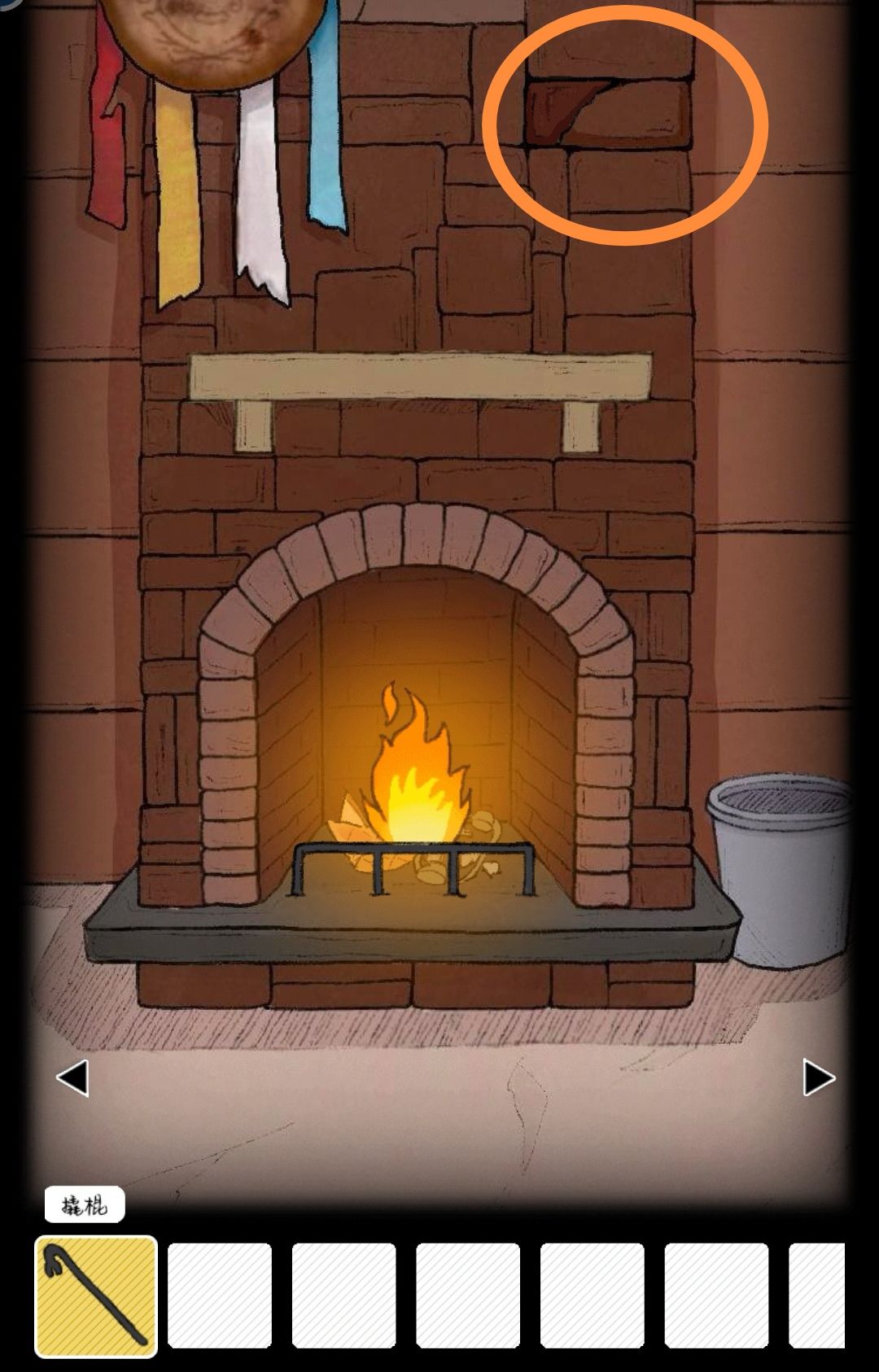用撬棍点击壁炉上破损砖块,得到残缺传单,放入原位置。