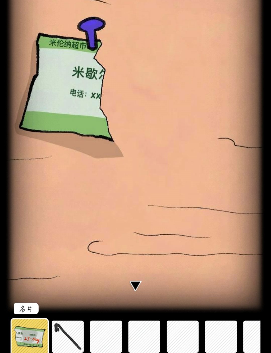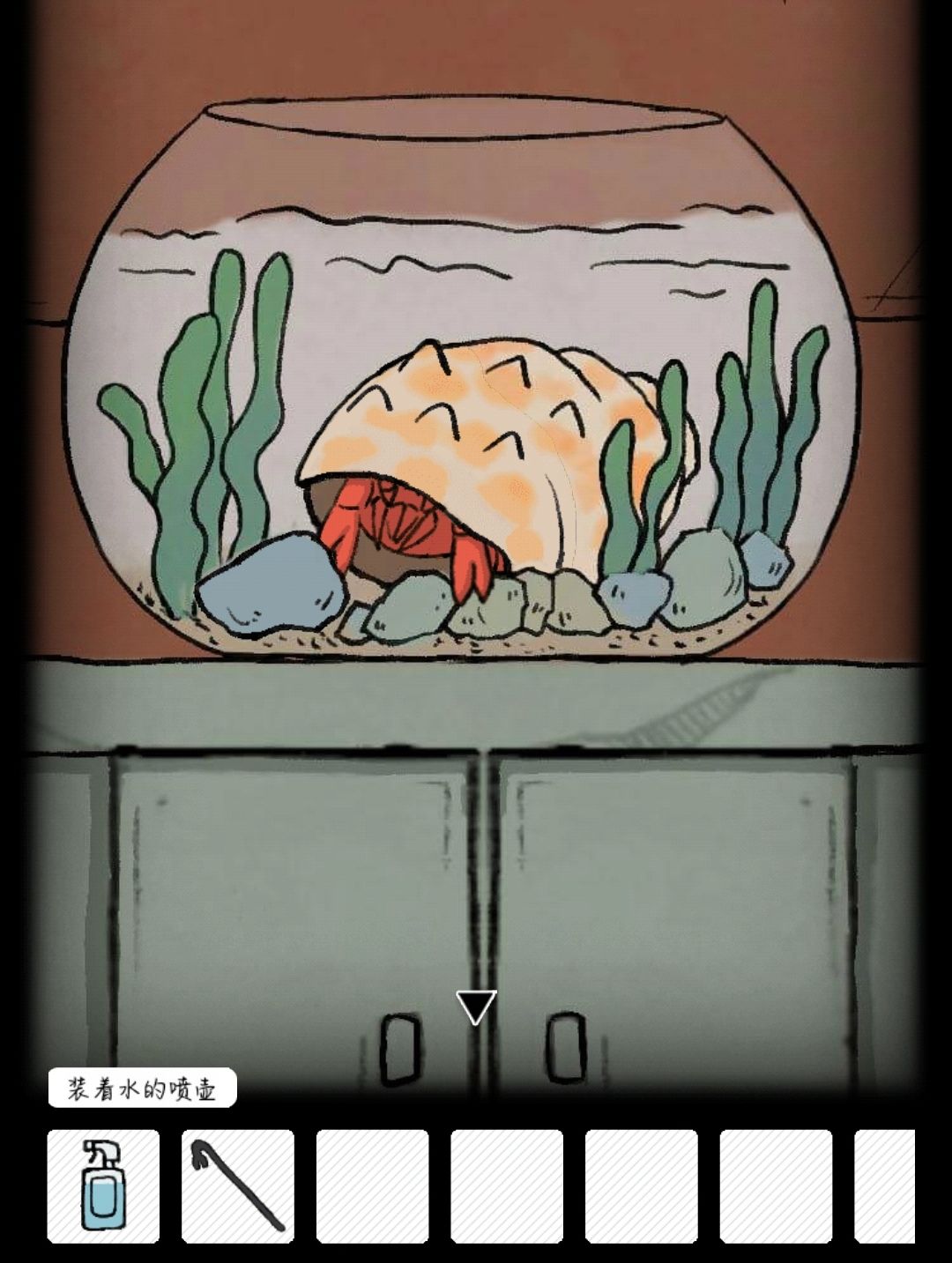 将空水壶放到水缸中,得到装满水的喷壶,用喷壶点击左侧盆栽会得到青虫,将青虫重新放入水缸得到破损名片,并换回原位置。